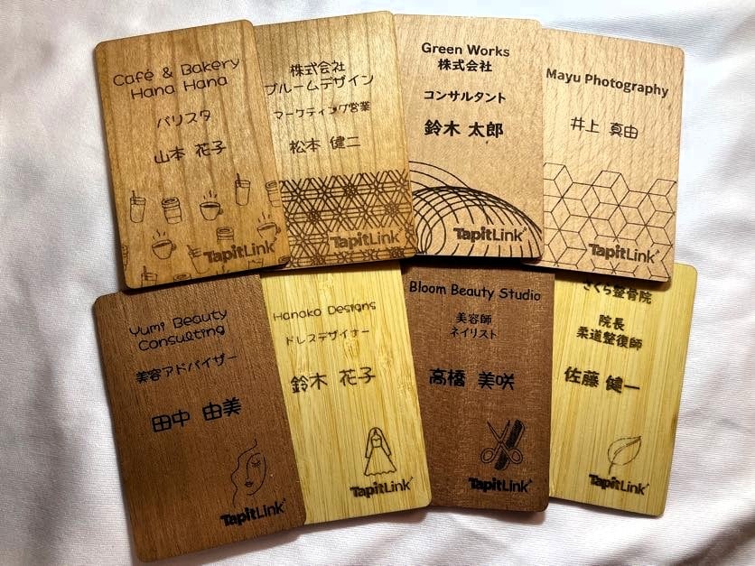 NFC木製カード名刺「TapitLink」は、DX時代に天然木とデジタルを融合した新しい名刺。SNSや実績をスマートに一括共有し、自己ブランディング・差別化をサポートします。FSC認証材や端材を活用したエコな素材、カスタマイズやスタッフ代行による安心のサービスで、大切な方へのギフトにも最適です。